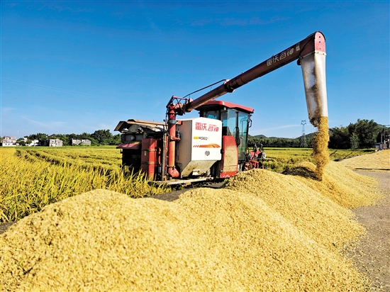 ??? 記者近日在臺(tái)山市白沙鎮(zhèn)看到,稻田里金黃的稻浪隨風(fēng)起伏,一片片滿目金黃、層層疊疊的稻穗顆粒飽滿;農(nóng)機(jī)手駕駛著收割機(jī)在金色的稻浪中來(lái)回穿梭作業(yè),一排排水稻被整齊地割下,經(jīng)過(guò)脫粒、分離等流程,直接輸送到田邊的曬場(chǎng)上。機(jī)聲隆隆、稻香陣陣,金黃稻田與美麗鄉(xiāng)村相互映襯,構(gòu)成一幅幅靚麗的田園畫(huà)卷。