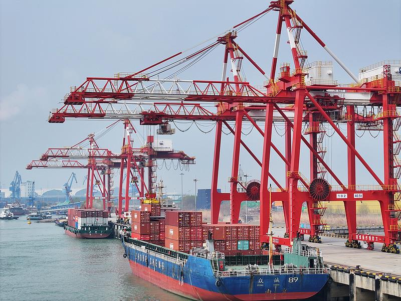 ??△江蘇揚州港,貨輪靠泊在港口裝卸貨物。