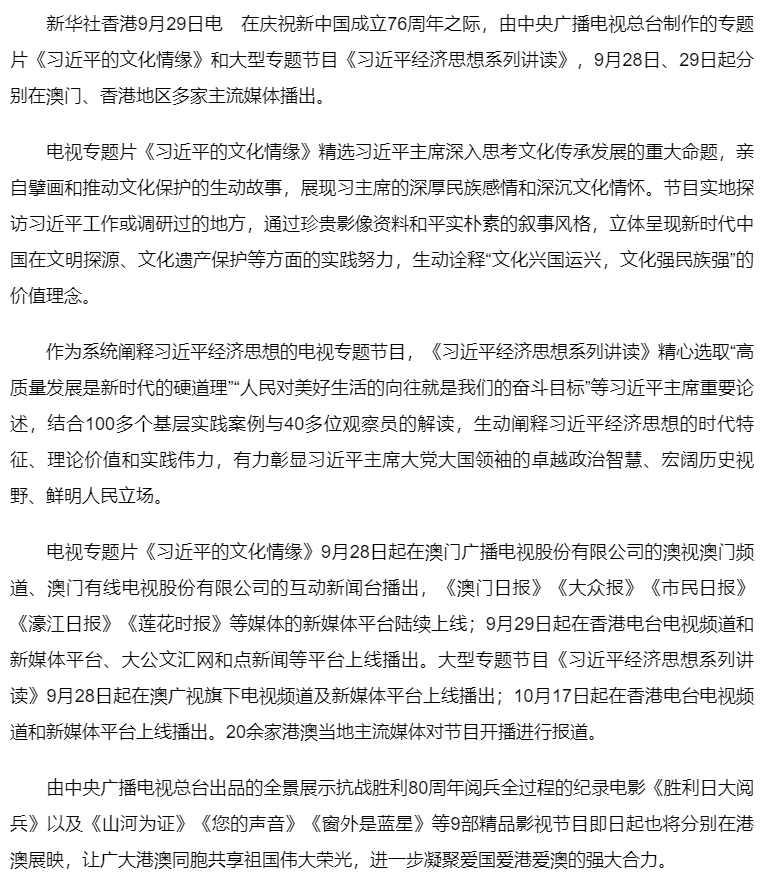《習(xí)近平的文化情緣》《習(xí)近平經(jīng)濟(jì)思想系列講讀》在港澳多家主流媒體播出
